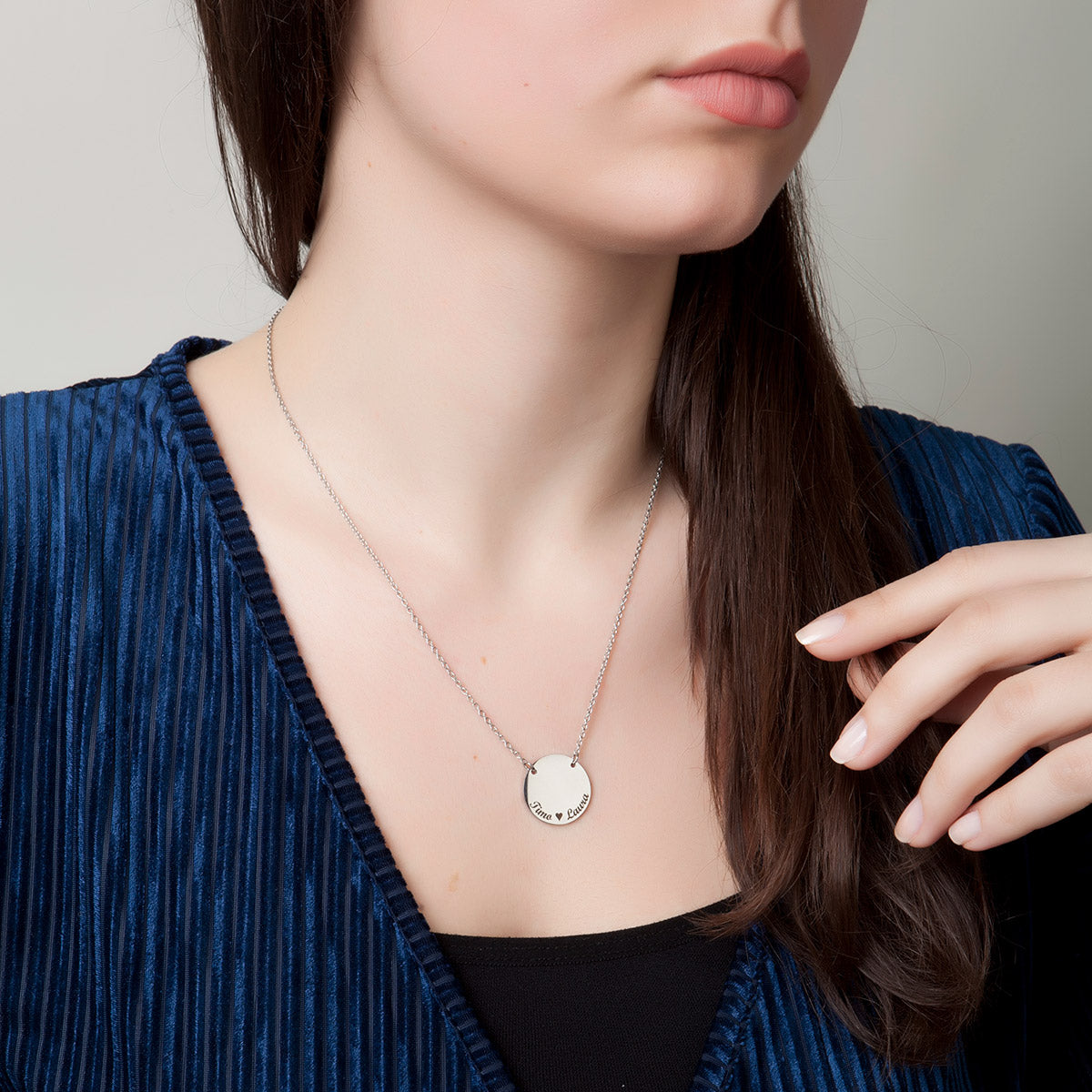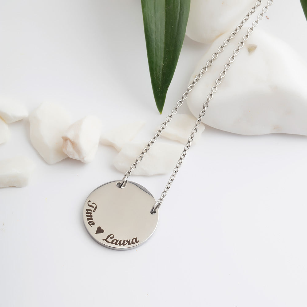 Schöner Anhänger aus Edelstahl mit einer kreisförmigen Gravurplatte.