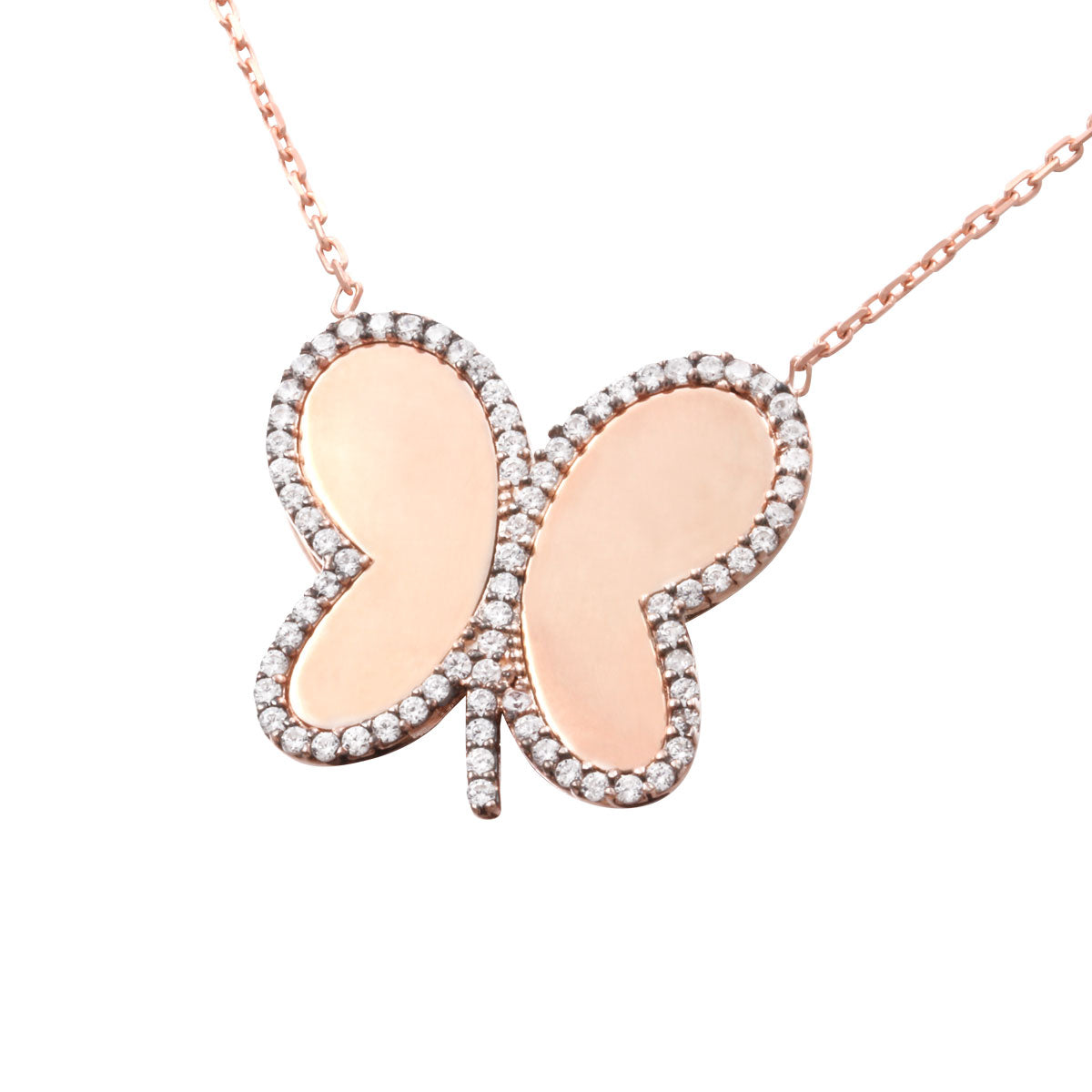 Der Anhänger hat die Form eines Schmetterlings und ist mit vielen Zirkonia verziert.