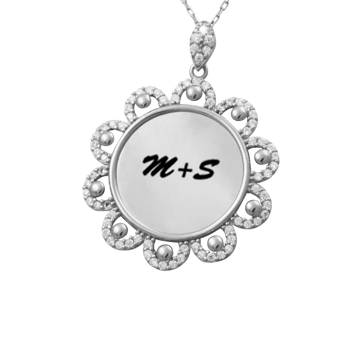 Der Anhänger hat die Form eines Kreises und ist mit vielen Zirkonia verziert.