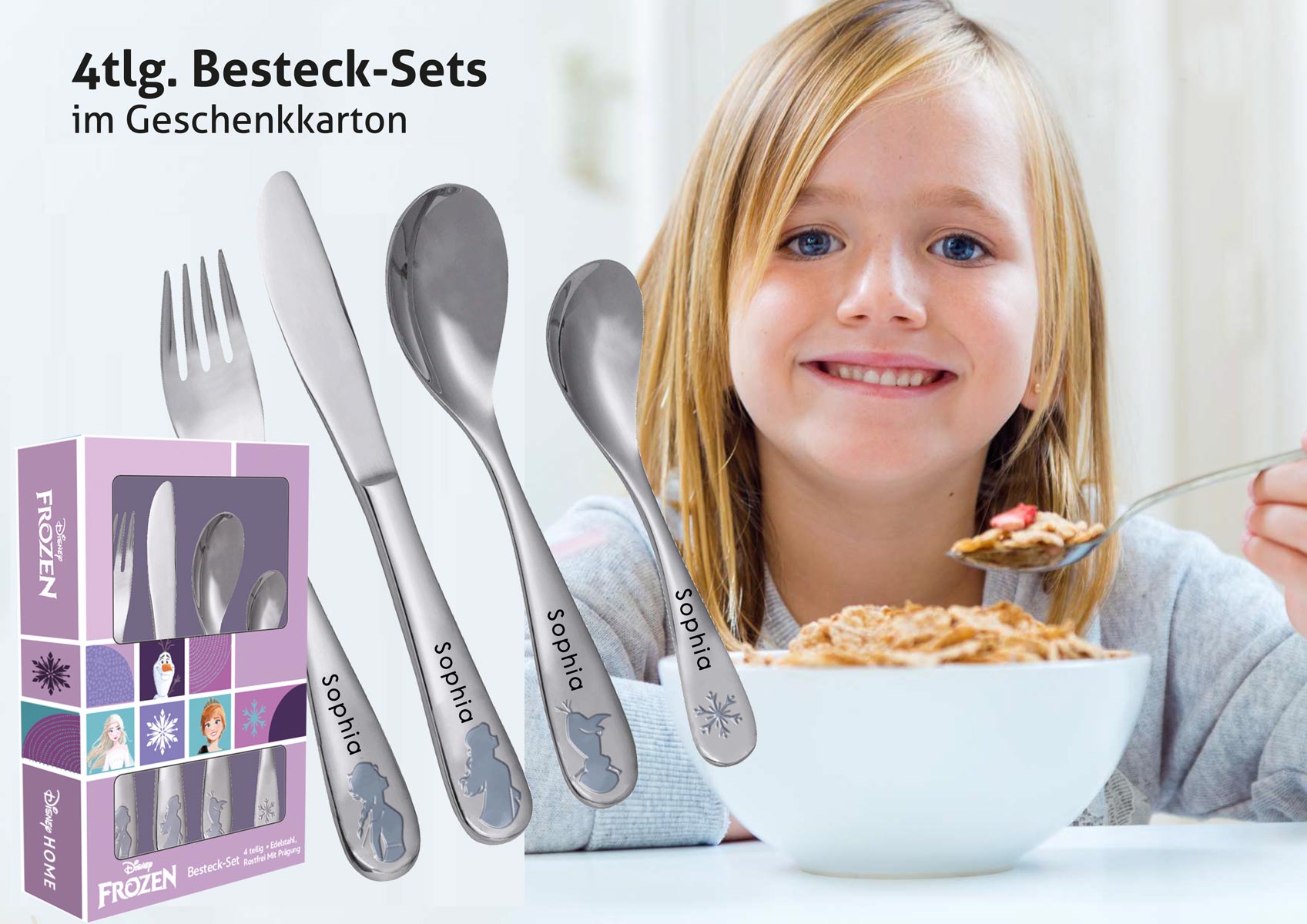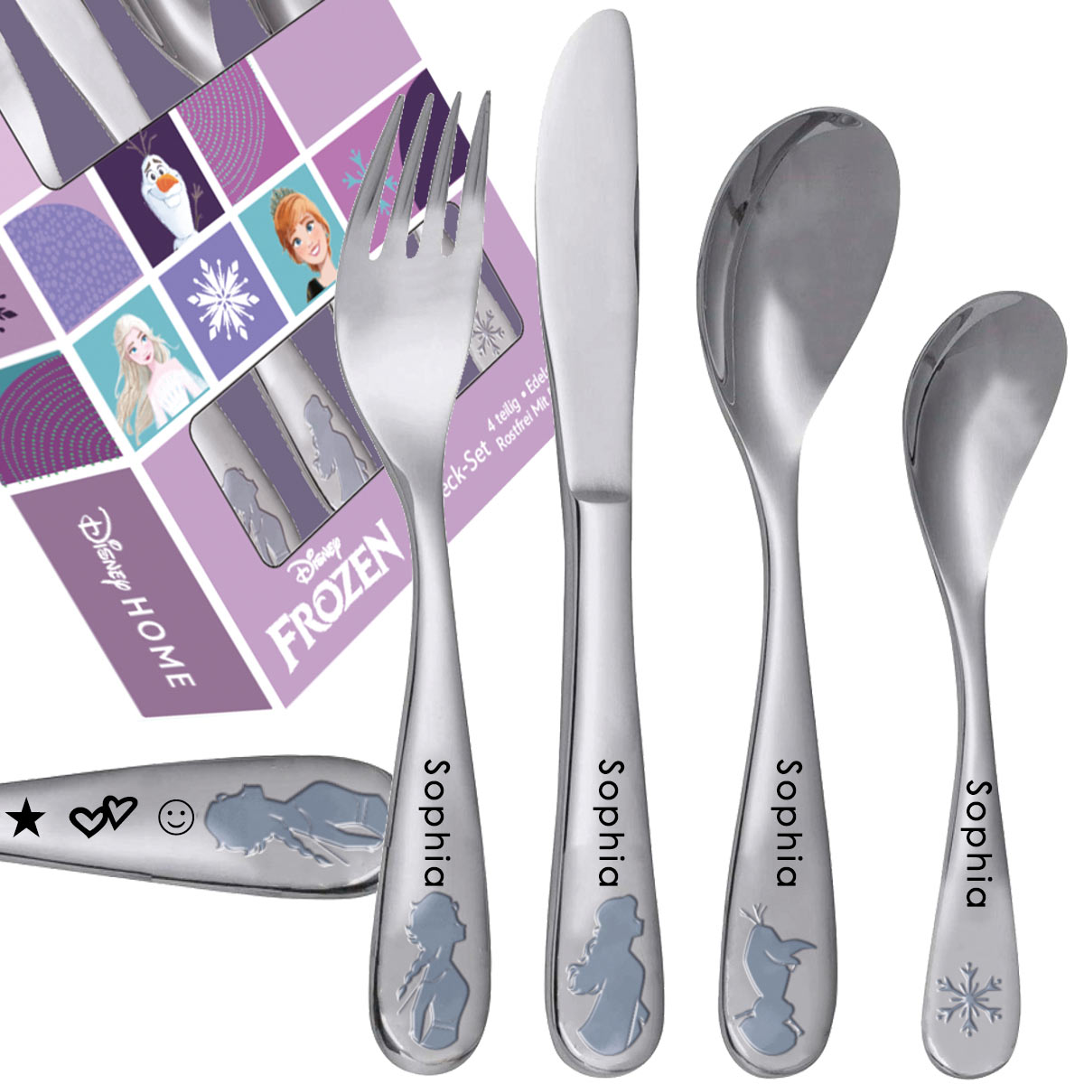 Frozen Eiskönigin Kinderbesteck mit Namensgravur | 4-telig | Edelstahl | Wunschgravur Symbole ♥ möglich| Rostfrei | Mit Prägung | Spülmaschinenfest