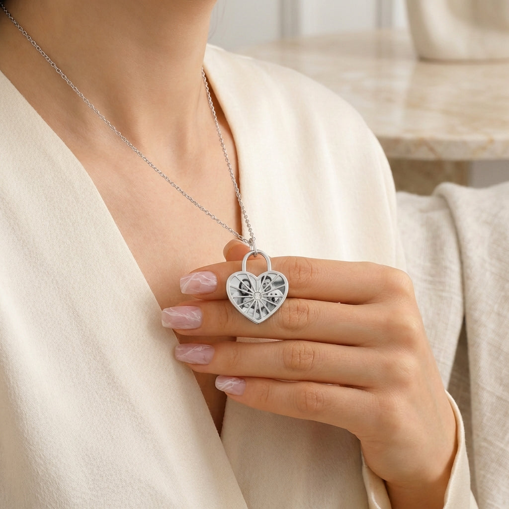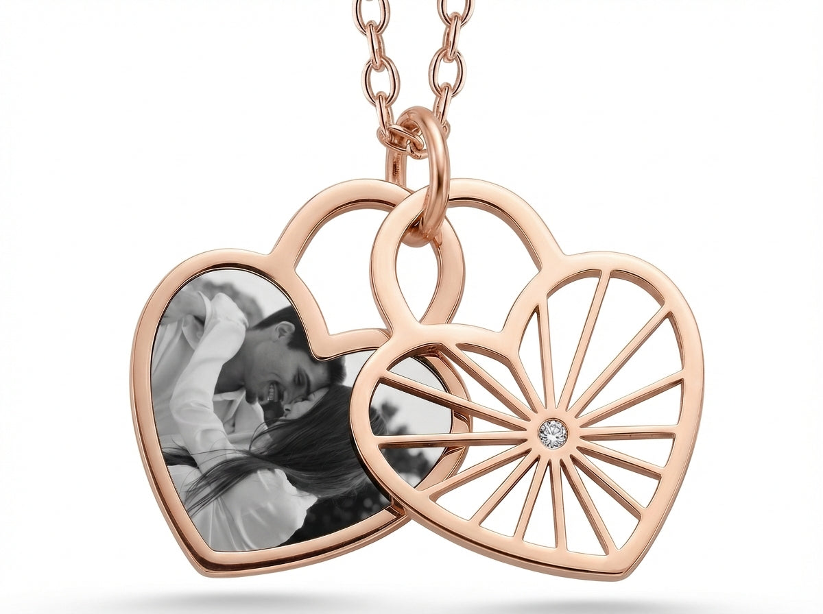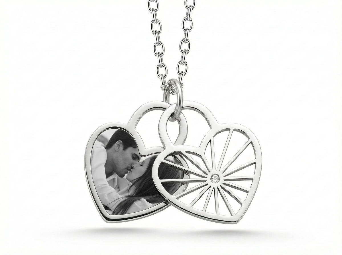Dein persoenlichster Schmuck: Der Herz Fotoanhaenger traegt deine Lieblingsmomente direkt am Herzen. Per praeziser Schwarz-Weiss-Lasergravur werden bis zu 4 deiner Fotos kunstvoll auf den Edelstahlanhaenger in Herzform uebertragen.