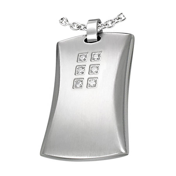 Der Anhänger ist rechteckig gehalten und mit 6 Steinchen verziert.