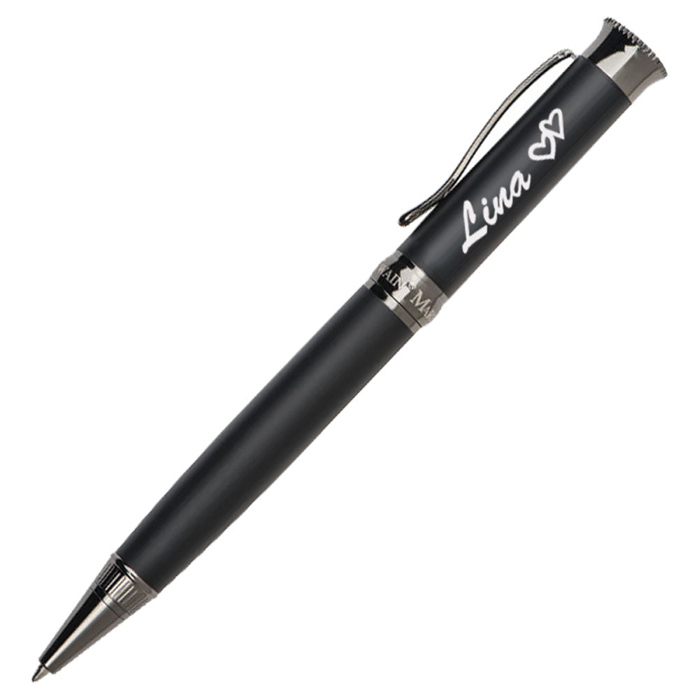 Mark Twain Kugelschreiber aus Metall mit Wunschgravur. Mark Twain Drehkugelschreiber aus Metall mit dunkel verchromten Applikationen und einer blau schreibenden Großraummine. Geliefert wird er in einem edlen Etui.
