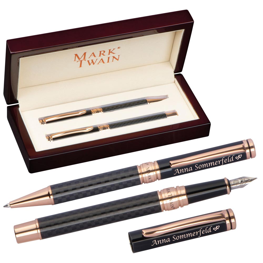 Mark Twain Schreibset bestehend aus einem blau schreibenden Drehkugelschreiber und einem Füllfederhalter aus Metall in Carbonoptik. Geliefert wird dieses Set in einer edlen, hochwertigen Holzbox. Ihre Wunschgravur wird auf beide Schreibgeräte graviert.