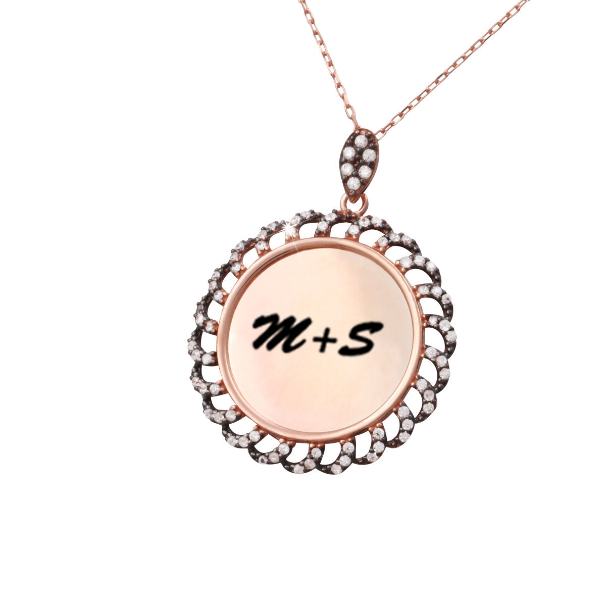 Der Anhänger hat die Form eines Kreises und ist mit vielen Zirkonia verziert.