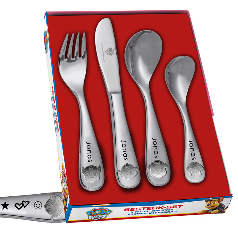 PAW Patrol Kinderbesteck mit Namensgravur (Symbole ♥ möglich) | 4-telig | Edelstahl | Rostfrei | Mit Prägung | Spülmaschinenfest | für Kinder ab 3 Jahren