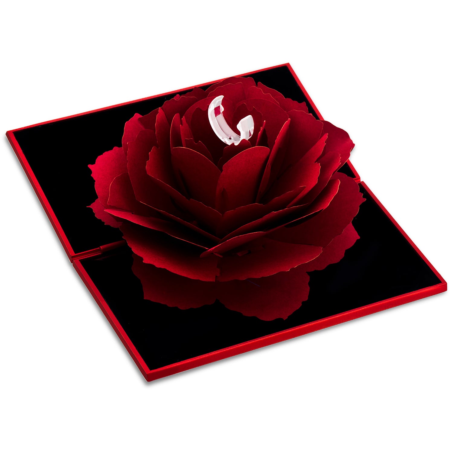 Rote Ringbox für ein ganz romantisches Geschenk. Beim öffnen der Box öffnet sich eine wunderschöne Rosenskulptur, die im Zentrum Ihren Ring trägt.
