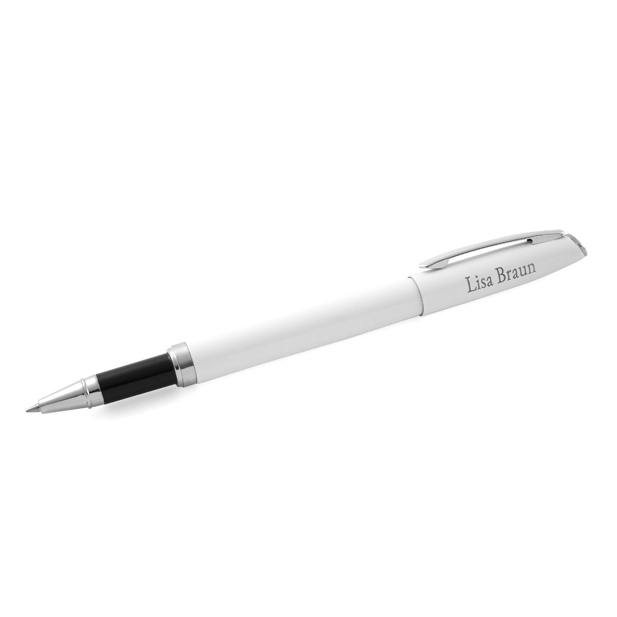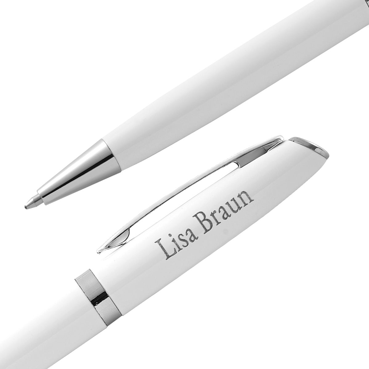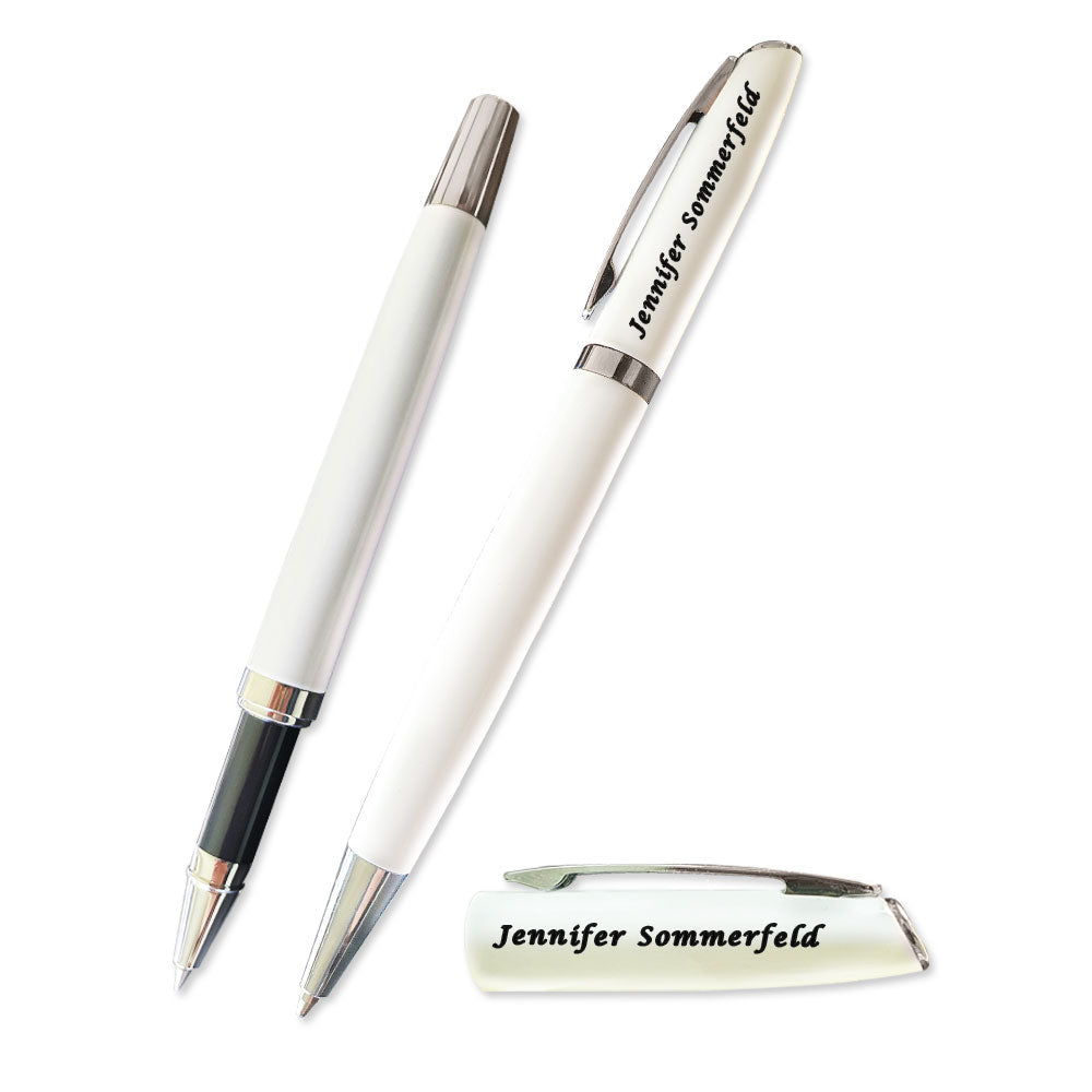 Schreibset in weiß mit Ihrem Wunschtext gravieren lassen und verschenken. Das Schreibset besteht aus einem Drehkugelschreiber (schwarzschreibend) und Rollerball (schwarzschreibend). Die passende Geschenkbox ist dabei.