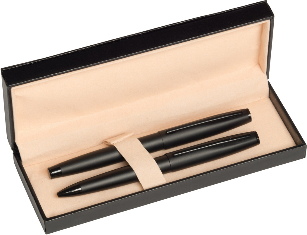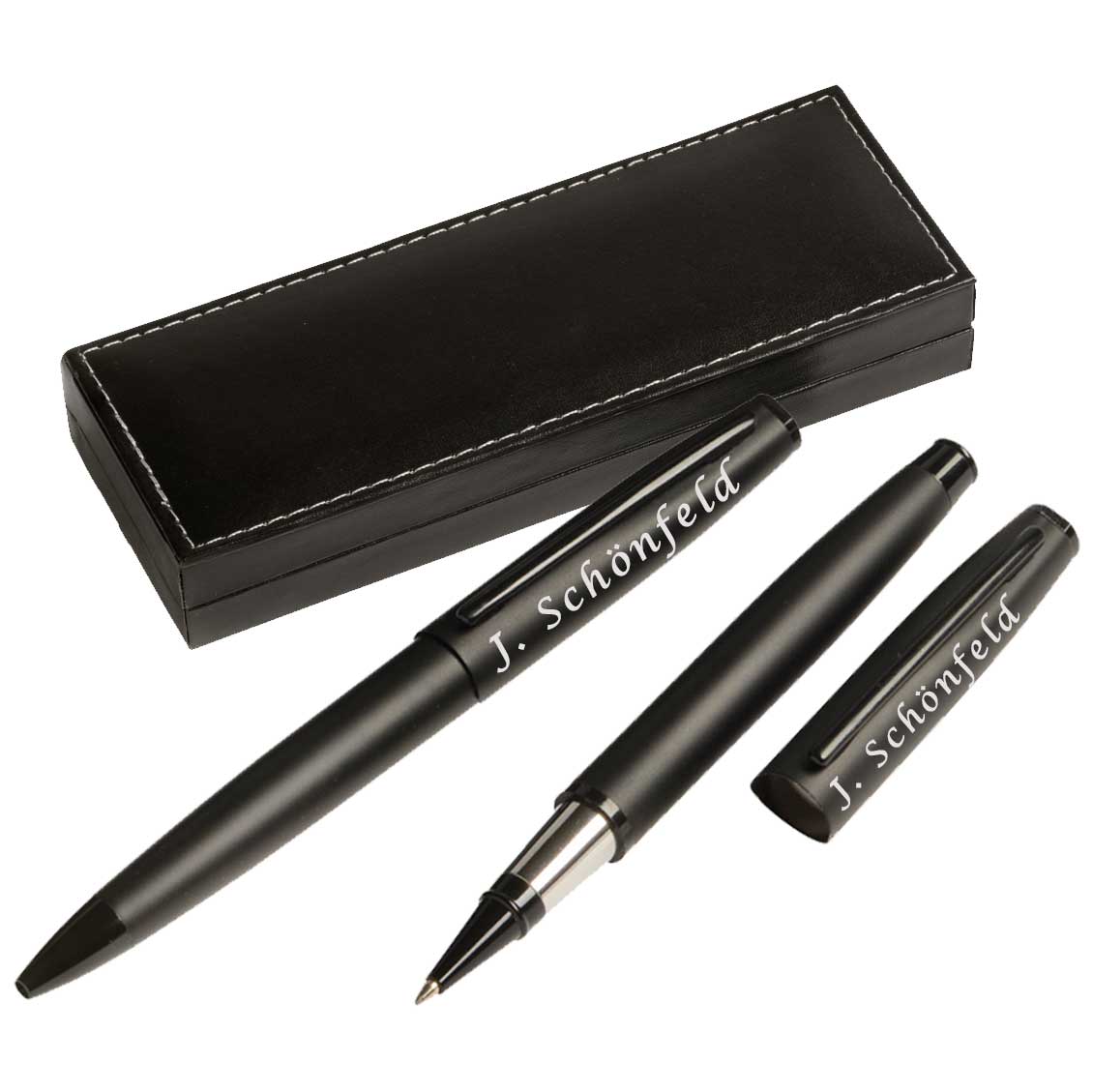 Schreibset inkl. Drehkugelschreiber (schwarzschreibend) und Rollerball (schwarzschreibend) mit Verschlusskappe, mit Chromunterlegung für eine glänzende Gravur, Lieferung im passenden Etui