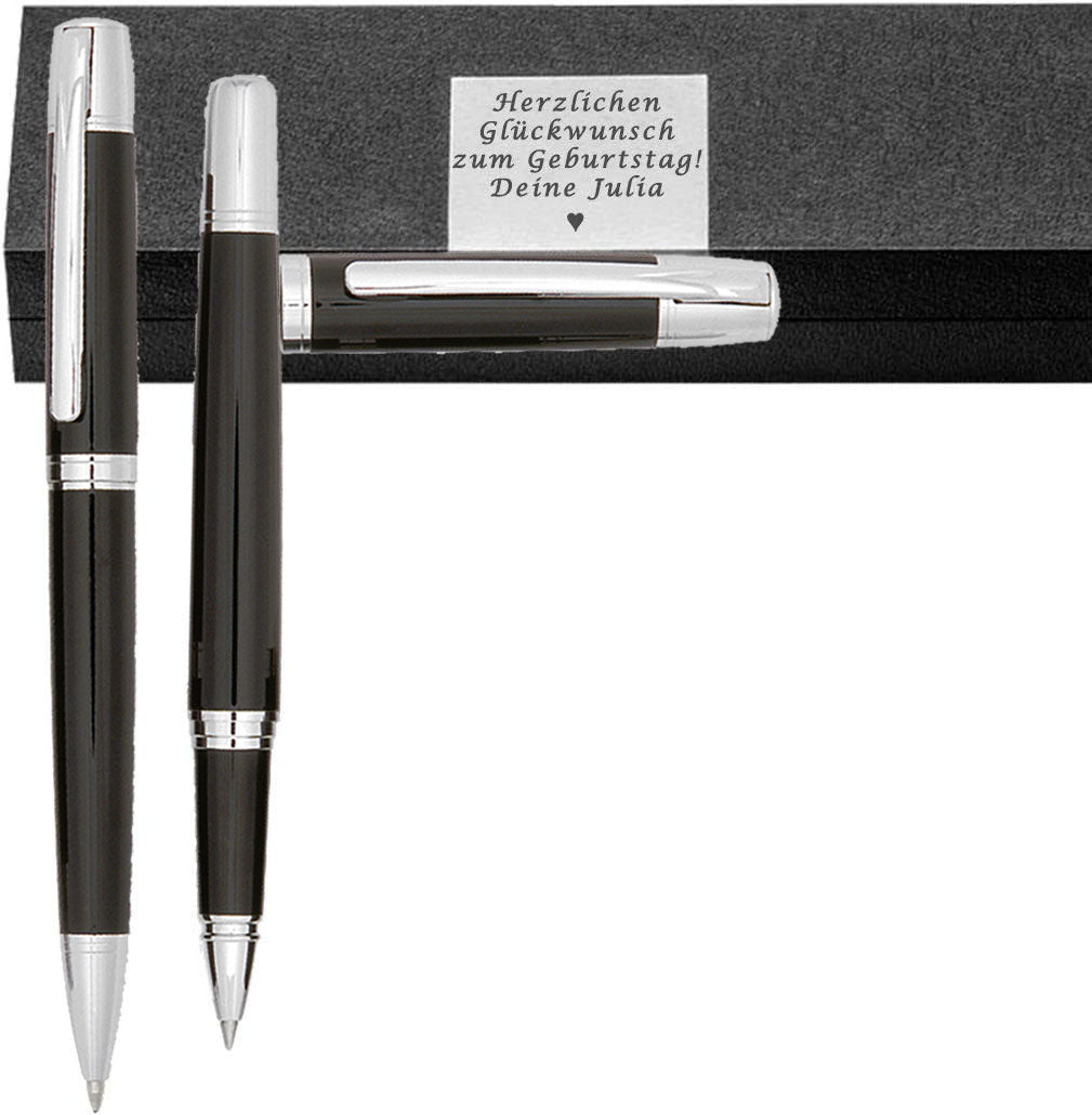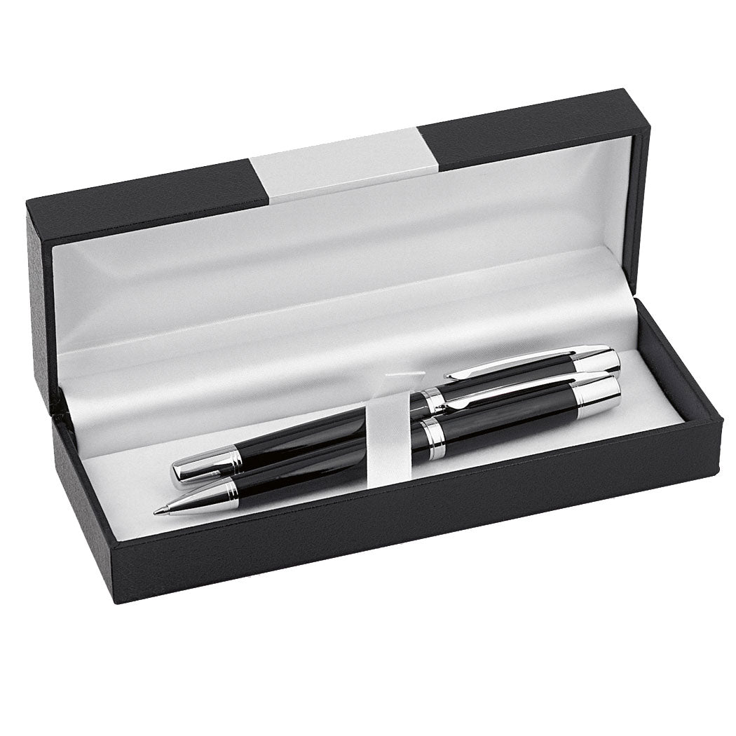 Schreibset STERLING: bestehend aus Metall-Tintenroller mit Verschlusskappe (schwarzschreibend) und Metall-Drehkugelschreiber mit Großraummine (blauschreibend), Lieferung in edler Geschenkbox mit Aluminiumplatte für Veredelung