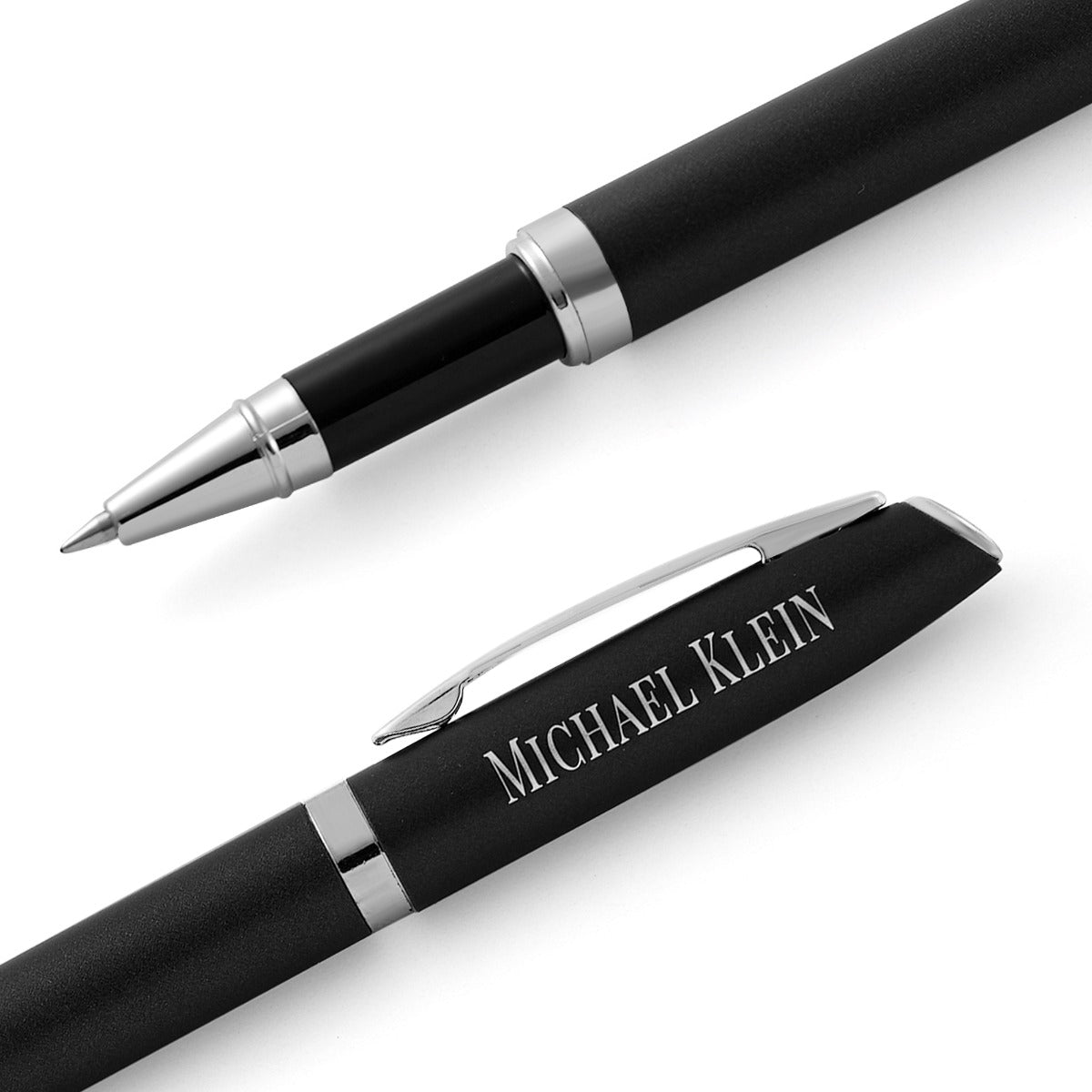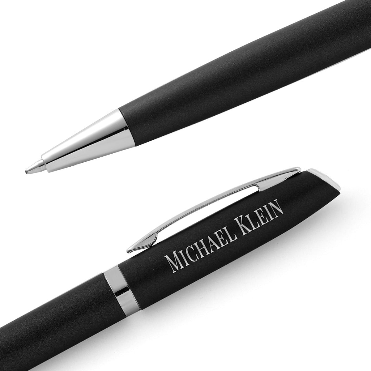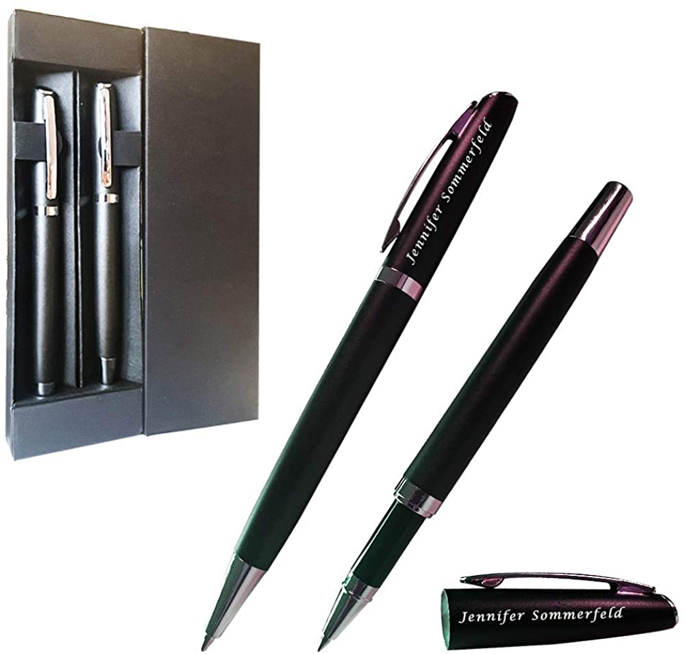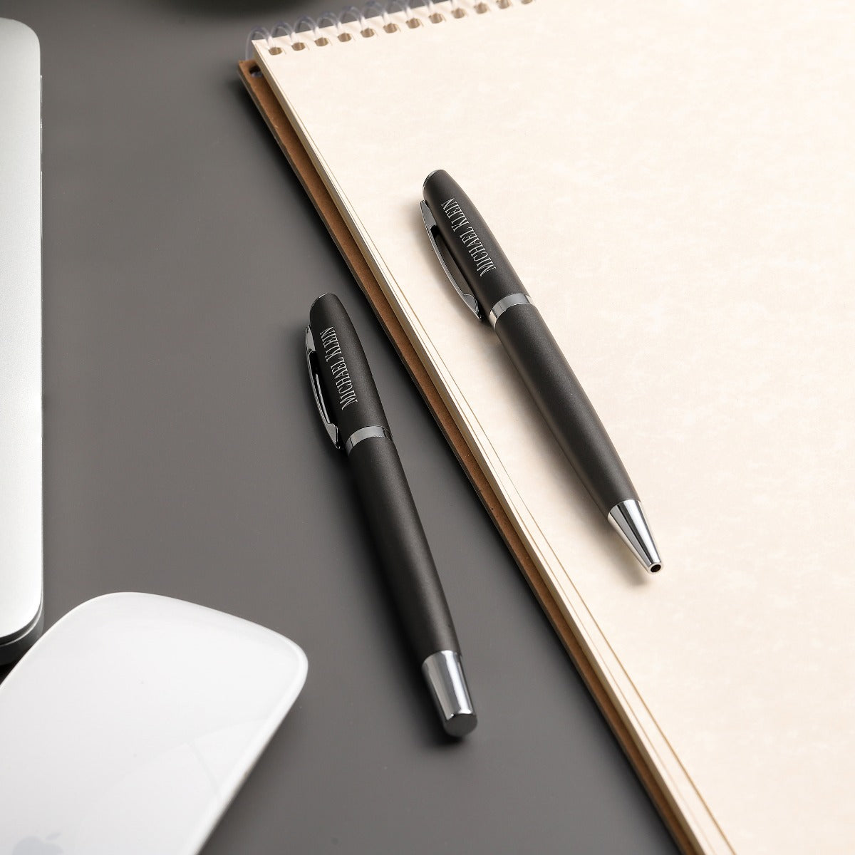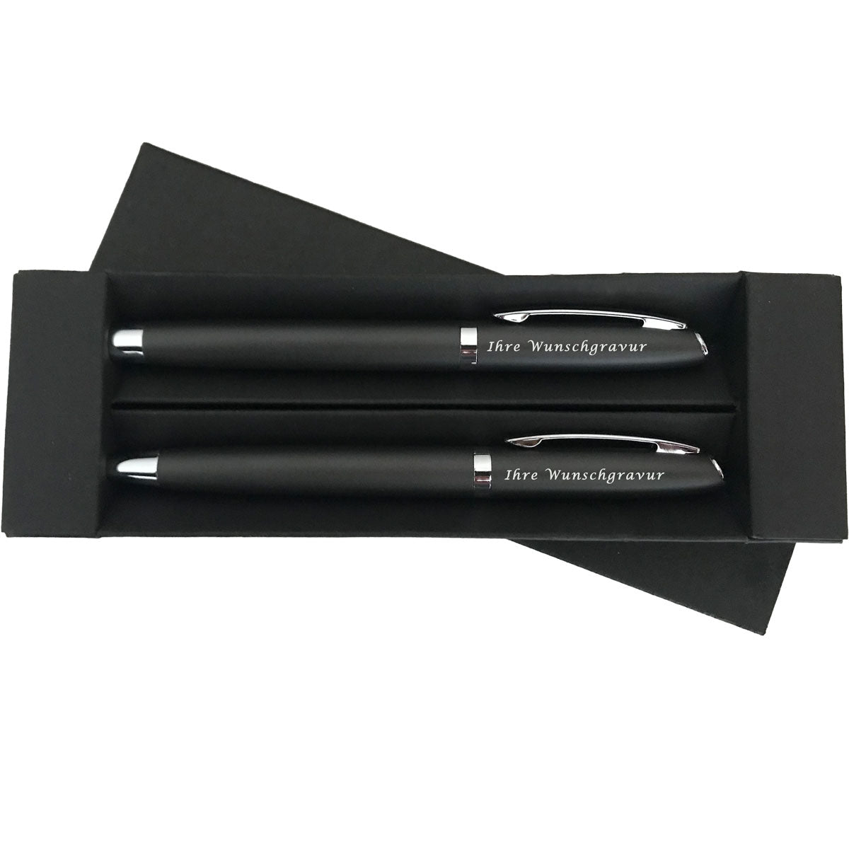 Schreibset in grau mit Ihrem Wunschtext gravieren lassen und verschenken. Das Schreibset besteht aus einem Drehkugelschreiber (schwarzschreibend) und Rollerball (schwarzschreibend). Die passende Geschenkbox ist dabei!