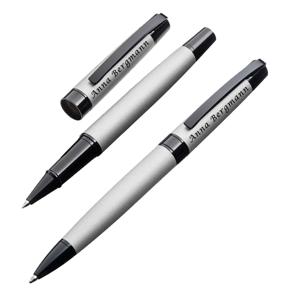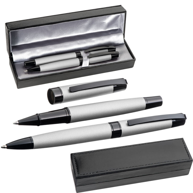 Schreibset bestehend aus einem Drehkugelschreiber mit Großraummine und einem Rollerball. Geliefert werden die Schreibgeräte in einer schlanken schwarzen Box