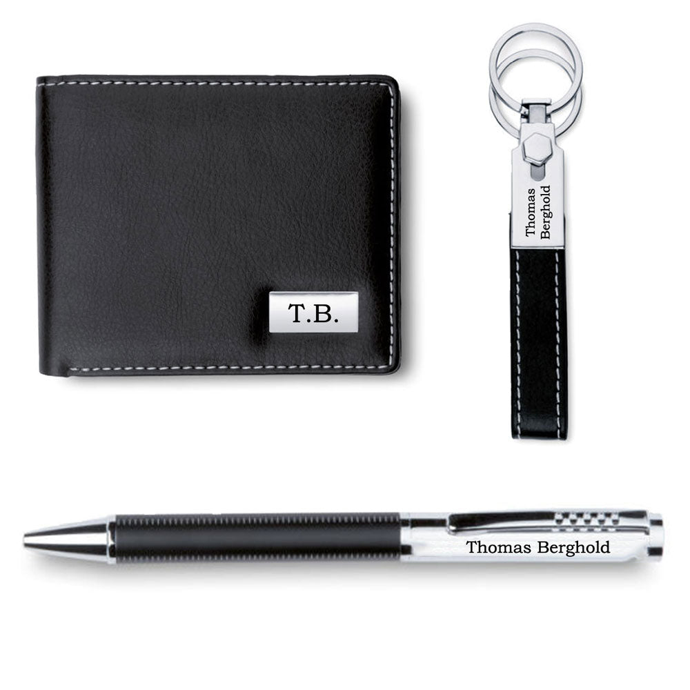 Elegantes Geschenkset in einer Geschenkschachtel bestehend aus: Kugelschreiber (blaue Tinte), Schlüsselanhänger und Geldbörse aus PU-Leder mit Kontrastnähten