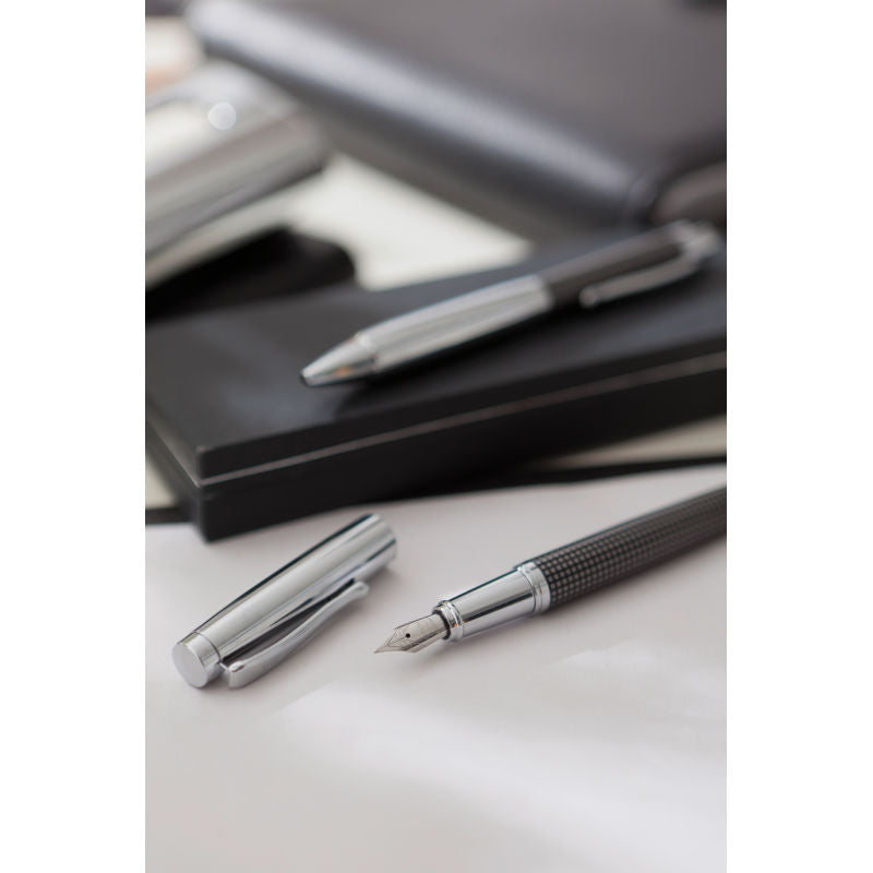 Sehr nobel, dieses Schreibset besteht aus einem blauschreibenden Metall-Druckkugelschreiber und einem Metall-Füller mit kariertem Dekor. Die beiden Stifte werden in einer hübschen Geschenkbox geliefert und können so direkt verschenkt werden.