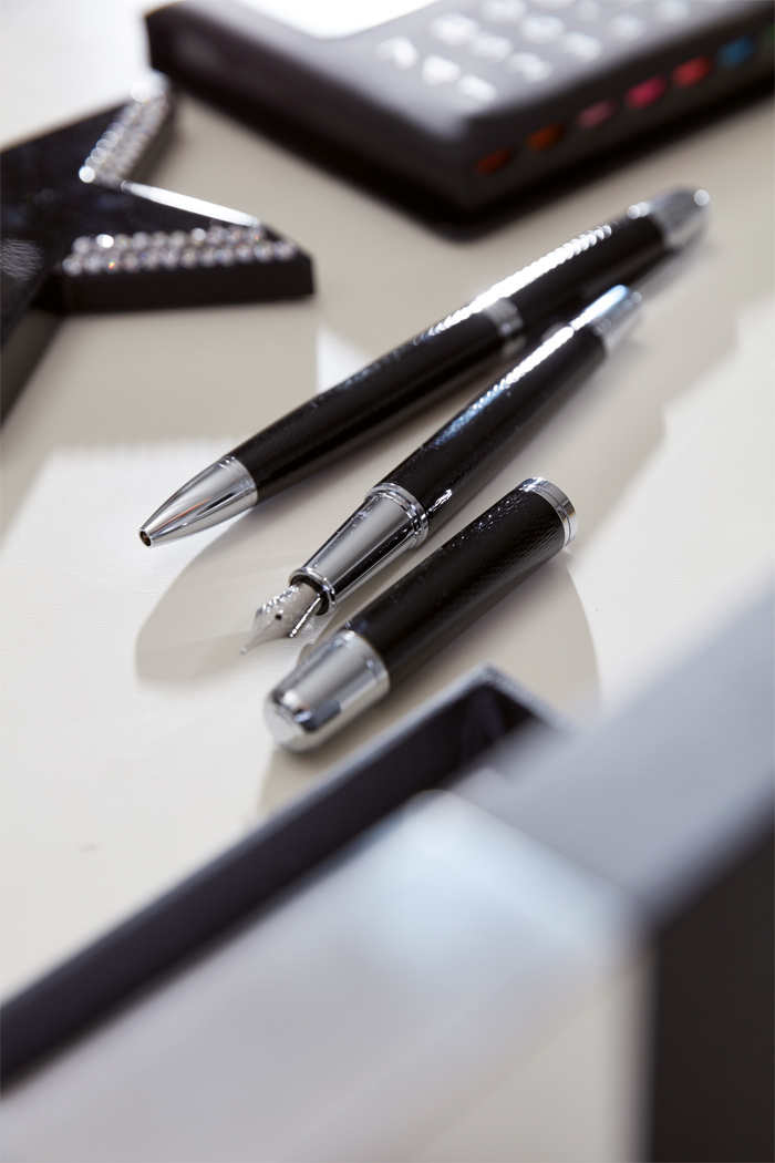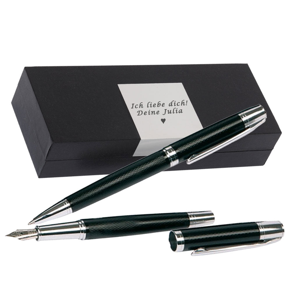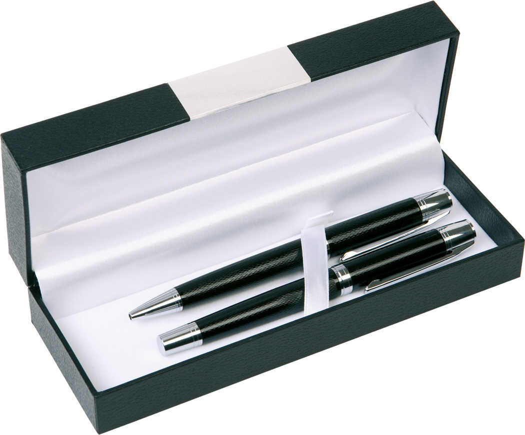 Schreibset bestehend aus Metall-Kugelschreiber (schwarzschreibend) und Metall-Füller, in edler Geschenkbox mit Aluminiumplatte, Farbe schwarz, silber, Größe 18 x 6,5 x 4 cm