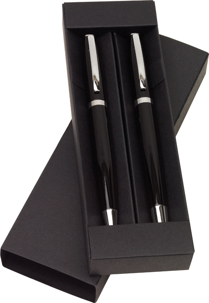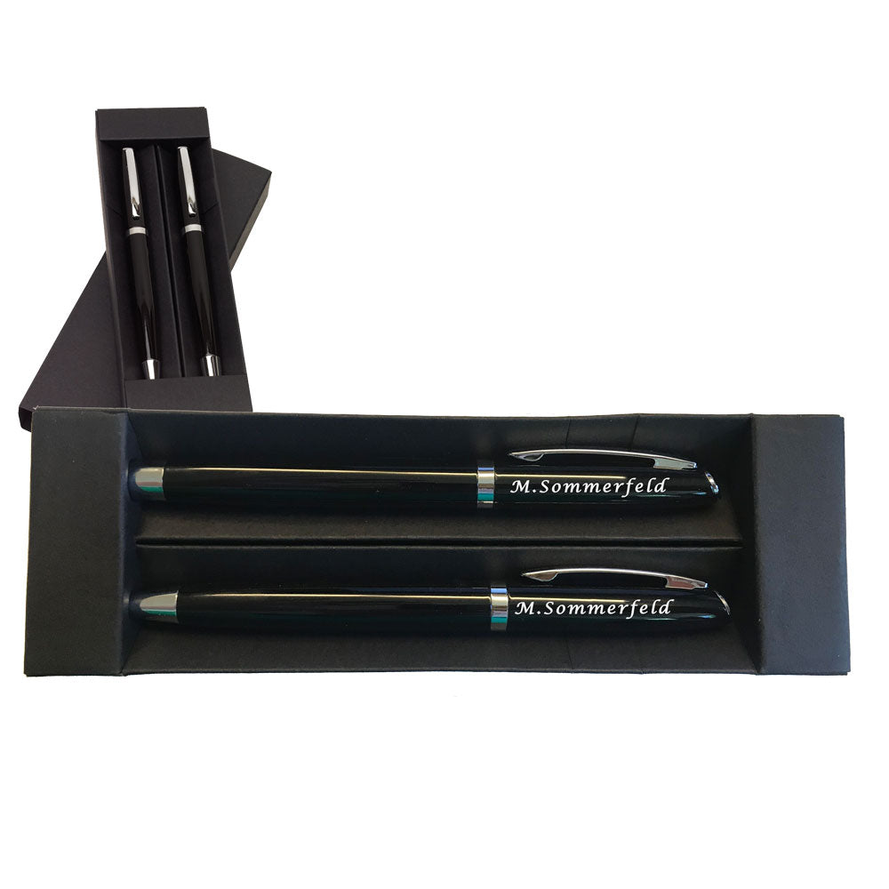 Schreibset in grau mit Ihrem Wunschtext gravieren lassen und verschenken. Das Schreibset besteht aus einem Drehkugelschreiber (schwarzschreibend) und Rollerball (schwarzschreibend). Die passende Geschenkbox ist dabei!
