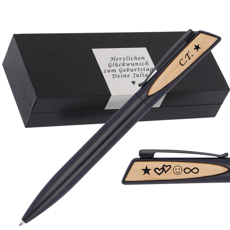 Schwarzer Kugelschreiber mit Gravur mit Bambusapplikationen auf beiden Seiten | blau schreibend | Kugelschreiber personalisiert |