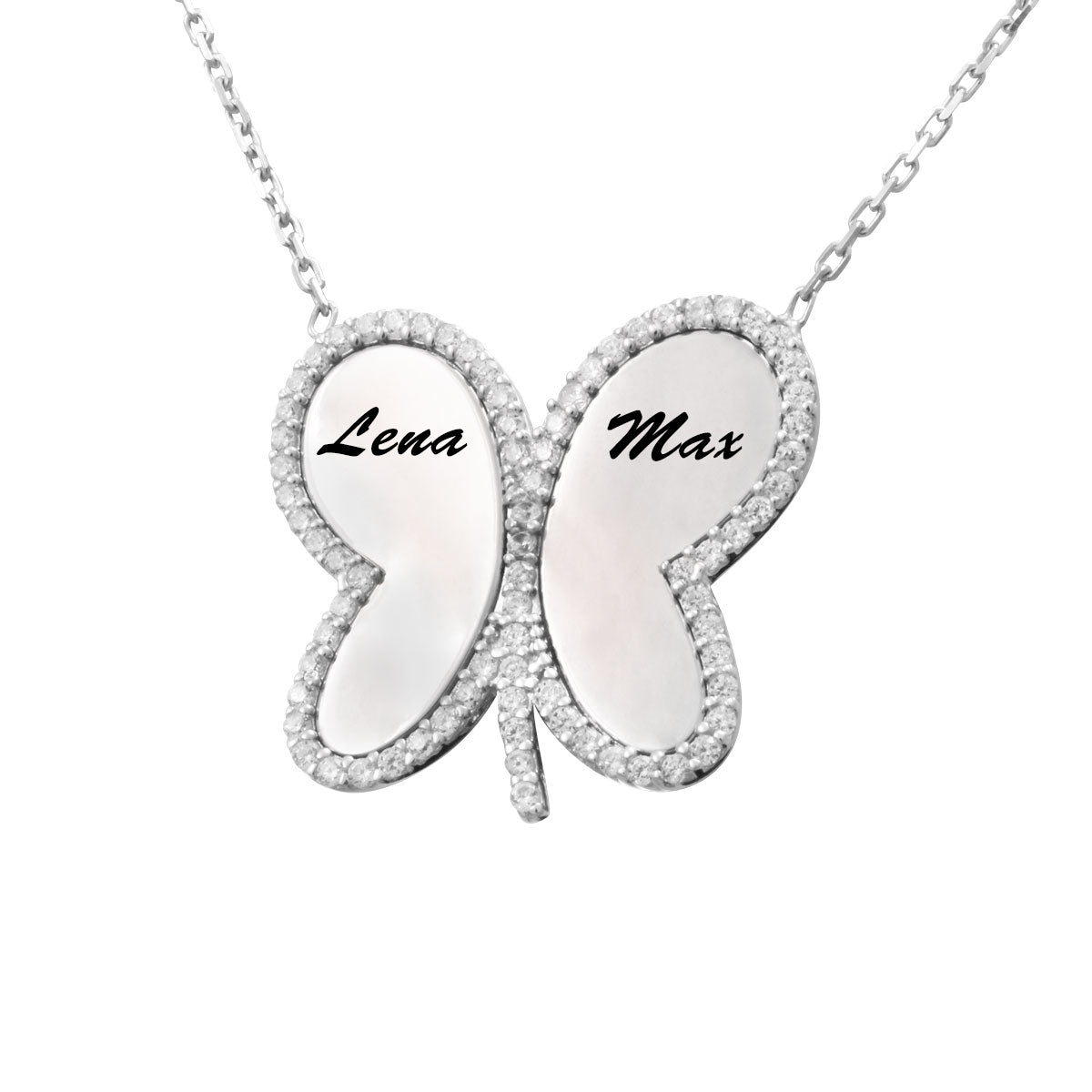 Der Anhänger hat die Form eines Schmetterlings und ist mit vielen Zirkonia verziert.