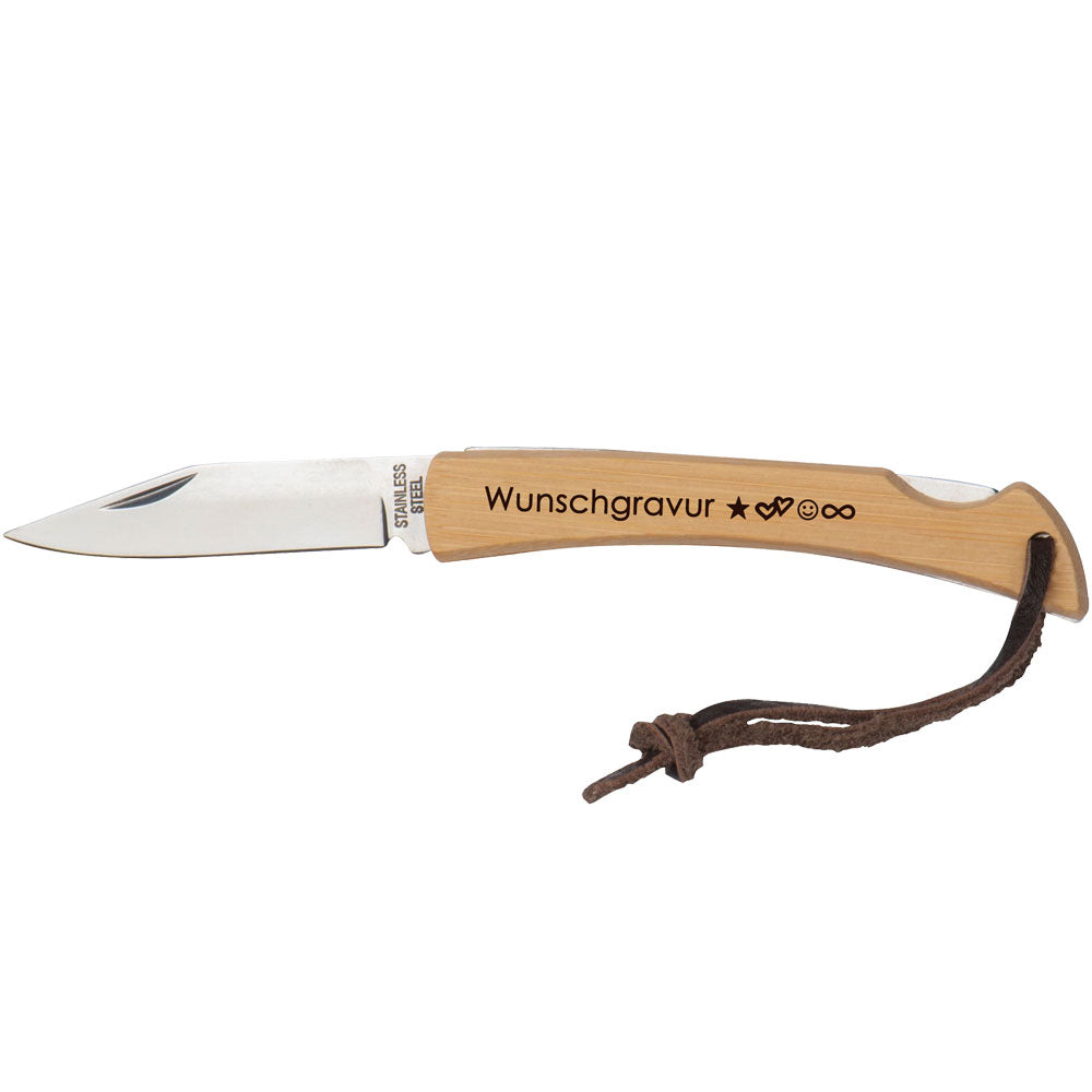 Taschenmesser mit Gravu aus Bambus mit Aufhängeschlaufe | Taschenmesser mit Wunschgravur | Sicherheitsverschluss | KN7
